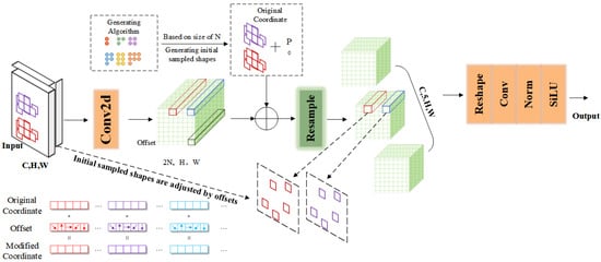 To address these shortcomings, this study introduces Adaptive Kernel Convolution (AKConv [17]) as a replacement for traditional convolution modules. As depicted in Figure 2, AKConv establishes an initial convolutional sampling pattern and employs Conv2D to process the input image. Learned offsets then adaptively reshape the sampling grid, after which the feature map is resampled and subsequently reshaped to produce the final output. This mechanism endows AKConv with kernels of arbitrary parameterization and geometric form, shattering the limitations of the fixed local windows and static sampling used in traditional convolutions. As a result, it more deftly captures the nuanced local features of pomegranate fruits across varied environments while simultaneously reducing both model complexity and computational overhead.