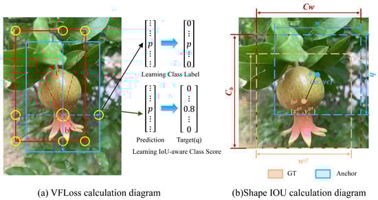 YOLOv11 employs BCE for classification, yet this loss does not align classification confidence with bounding box accuracy. Consequently, detections with a high IoU may be mistakenly removed by non-maximum suppression if their classification scores are insufficient. As depicted in Figure 4a, the Varifocal Loss (VFLoss [19]) introduces an asymmetric weighting scheme: nine candidate anchors are arranged equidistantly around each ground-truth box, with the central anchor labeled as positive and the other eight as negative. Traditional classification loss merely predicts whether a box belongs to class p. In contrast, the IoU-aware branch of VFLoss introduces a scalar that quantifies the quality of the overlap between each anchor and its ground-truth box. This mechanism directs the model’s attention to hard-to-classify positives, mitigating class imbalance and improving the effectiveness of subsequent non-maximum suppression. The loss is defined as follows:
