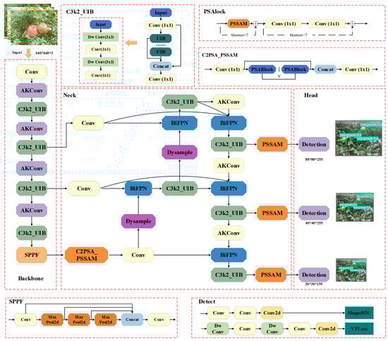 The principal enhancements we made to the model are as follows: (1) using AKConv modules to replace conventional convolutions within the backbone and further optimizing the C3k2 module through integration with the Universal Inverted Bottleneck (UIB) structure, significantly reducing model complexity; (2) introducing a novel module, PSSAM, to improve the C2PSA component and strategically adding an attention mechanism at the interface between the neck and head networks; (3) proposing an optimized Dynamic Adaptive Bidirectional Feature Pyramid Network (DA-BiFPN) architecture for the neck region, effectively enhancing the model’s feature recognition and fusion capabilities for multi-scale and overlapping fruits, thereby substantially boosting its detection precision.