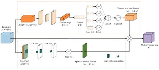 To enhance the model’s capacity to capture intricate local details and seamlessly integrate channel information, we designed an innovative attention module, the PSSAM, which is depicted in Figure 6. Inspired by the concept of parallel cascading, PSSAM’s channel attention branch employs a multi-path strategy [21]: Following adaptive average pooling, several parallel fully connected layers execute squeeze-and-excitation actions, and subsequent feature scaling sharpens representation granularity while seamlessly integrating global contexts. Concurrently, the spatial branch concatenates the average and max pooling outputs and employs decomposed convolutions (7 × 1 and 1 × 7) to extract horizontal and vertical local spatial features, with a subsequent Sigmoid activation generating spatial attention weights. Finally, channel and spatial attention outputs are fused using a preset ratio (for instance, 0.7:0.3) to achieve the fine-grained modulation of input features.
