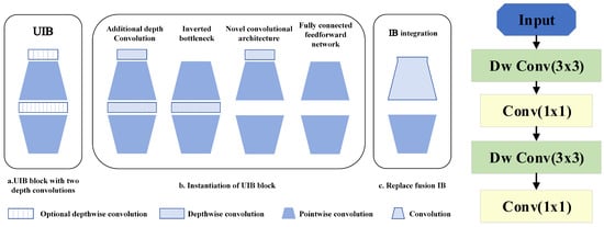 In the context of pomegranate fruit detection, the original C3k2 module in YOLOv11 exhibits several limitations, including its high computational complexity, redundant feature representations, and insufficient ability to capture localized features. These shortcomings hinder the accurate extraction of multi-scale fruit characteristics, particularly under complex and unstructured environmental conditions. To mitigate these issues, this study introduces the Universal Inverted Bottleneck (UIB) module, derived from MobileNet V4, to enhance the C3k2 architecture, resulting in the proposed C3k2_UIB module. This refined structure integrates two optional depthwise separable convolutions, which collectively improve the module’s flexibility and efficiency in feature extraction. Specifically, the first depthwise convolution—located prior to the expansion layer—facilitates the early-stage processing of input features, thereby improving the capture of low-level spatial details. The second depthwise convolution—inserted between the expansion and projection layers—further augments the network’s capacity to extract high-level semantic information. Together, these enhancements substantially strengthen the model’s ability to recognize pomegranate fruit features under visually complex conditions. The architectural details of the C3k2_UIB module are depicted in Figure 7.