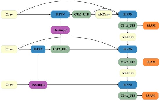 To address the aforementioned limitations, this study proposes an enhanced Dynamic Adaptive Bidirectional Feature Pyramid Network (DA-BiFPN) module, which is illustrated in Figure 8. The redesigned architecture substitutes the original neck component with a BiFPN structure, enabling efficient bidirectional feature fusion through simultaneous top-down and bottom-up information propagation. Furthermore, we incorporate a Dy-sample module that leverages point-wise resampling to replace costly dynamic convolutions and eliminate auxiliary subnetworks for adaptive kernel generation. This integration not only improves computational efficiency but also effectively suppresses redundant information during multi-scale feature fusion. As a result, the proposed DA-BiFPN module markedly enhances the quality of feature representation and contributes to improved detection accuracy, particularly in scenarios involving complex object distributions and scale variations.
