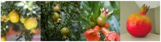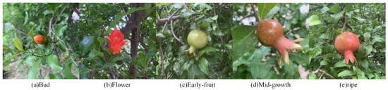 The dataset used in this study comprises publicly accessible images that depict the various developmental stages of pomegranate fruits and have been sourced from online repositories. Representative images from the dataset are presented in Figure 9. This comprehensive collection consists of 5857 meticulously annotated images categorized into five distinct growth stages: budding, flowering, early fruiting, intermediate fruiting, and maturity. The images were partitioned, based on a ratio of 7:1.5:1.5, into training, validation, and testing subsets, respectively. Specifically, 4100 images were allocated to the training set, 585 images were designated for validation, and an additional 585 images were reserved for testing [22].