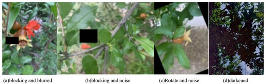 To diversify our dataset, we collected an additional 445 images (1280 × 720 px) of pomegranates: fully ripened fruits photographed under standardized indoor lighting and specimens from successive growth stages in Huili orchards, Sichuan. Every image was precisely annotated in LabelMe with bounding boxes and matching label files. Representative samples of the augmented dataset appear in Figure 10.