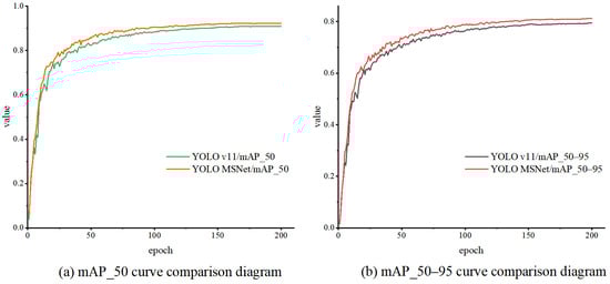 In this section, upon the completion of their training, both the proposed YOLO-MSNet and the original YOLO v11n models were evaluated using the same validation dataset. Their respective performance curves—depicting precision, recall, and mean average precision (mAP)—are illustrated in Figure 12. These evaluation metrics, which measure the effectiveness of each model in detecting pomegranate fruits across various growth stages, were detailed previously in Section 3.4.4 Figure 12 shows precision–recall curves that highlight YOLO-MSNet’s clear advantage over YOLO v11n: at the same recall, YOLO-MSNet delivers a substantially higher precision, while at the same precision, it yields a significantly greater recall. Based on these comprehensive performance comparisons, it is evident that the enhanced YOLO-MSNet model introduced in this study achieves remarkable improvements in precision, recall, and overall mAP, displaying a superior performance on the publicly available pomegranate image dataset.