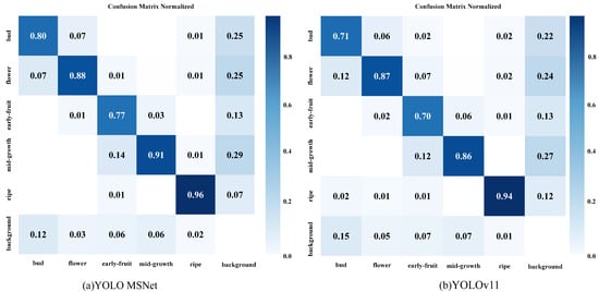 Figure 13 presents confusion matrices that illustrate the detection performance of both the baseline YOLO v11n model and the refined YOLO-MSNet. These matrices offer a clear and intuitive comparison of the classification capabilities for each model across the various growth stages of pomegranate fruits, with each column representing predicted classes and each row denoting actual classes. Within the dataset, the deep crimson of the mature fruit stands in stark relief against the dark emerald foliage, facilitating effortless detection. In contrast, early-fruit pomegranates (those in their green phase) blend into the leaves and branches, causing confidence scores to wane. To remedy this, we integrated PSSAM and DA-BiFPN modules into the baseline architecture, sharpening the network’s perception of nuanced color and texture cues. The confusion matrix reveals that under challenging conditions, the mAP of early fruit detection climbed from 72% to 82%, while the mAP of detecting buds rose by 6%.