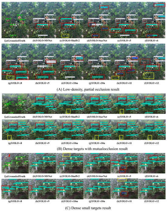 In Figure 14A, under sparse layouts and with partial occlusions, most detectors—except YOLO-MSNet, YOLOv11, and YOLOv10n—suffer from numerous false positives and missed detections. Conversely, in densely packed scenes with small overlapping fruits and foliage, their detection accuracy drops sharply due to severe interference. Moreover, due to the low contrast between early-stage fruits (green-phase fruits) and the surrounding leaves and branches in the dataset, downscaling images exacerbates confusion among similarly colored vegetation. However, YOLO-MSNet consistently maintains its high-confidence detections, as illustrated in Figure 14B,C. These observations indicate that YOLO-MSNet can reliably identify and classify pomegranate fruits throughout their growth stages, benefiting significantly from the enhanced feature extraction capabilities offered by its PSSAM and DA-BiFPN modules. Though minor instances of missed or false detections may still occur under certain challenging conditions, the model consistently achieves high accuracy when dealing with unobstructed or mildly obstructed scenarios. In contexts presenting clearly distinguishable fruit characteristics, misclassification and missed detections are virtually absent, whereas severe occlusions and irregular plant growth patterns occasionally result in incomplete feature representations, such as potential errors or omissions.