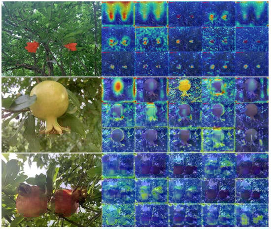 By examining the heatmaps in Figure 15, we can see that YOLO-MSNet’s feature maps, which operate at different depths, exhibit unique activation patterns for pomegranates across their growth stages. Areas contributing significantly to model detection are indicated in red, while regions with minimal contribution are depicted in blue. These visualizations demonstrate YOLO-MSNet’s exceptional ability to focus on the morphological characteristics of the fruits with precision, effectively suppressing background interference and adeptly addressing fruit detection challenges within complex orchard environments. This illustrates that the integration of modules such as PSSAM and DA-BiFPN enables the network to acquire discriminative, multi-scale features that are tailored to intricate orchard settings, effectively capturing key fruit details while avoiding excessive activation in irrelevant background regions (e.g., foliage). Consequently, YOLO-MSNet achieves a harmonious balance between accuracy and real-time performance, characterized by its fewer parameters and improved inference speed.