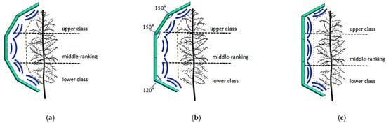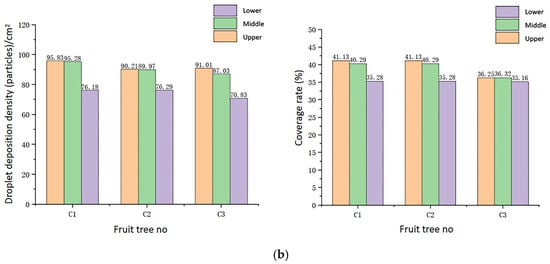 - Based on the field experimental data of spray droplet deposition, when the optimized orchard dual flexible duct spraying device is in operation, the average inner canopy spray droplet coverage is 35.88%, indicating that the sprayer has excellent penetrability. The average inner canopy spray droplet deposition density is 74.53 droplets/cm2, demonstrating an efficient deposition of spray droplets within the tree’s inner canopy. The vertical distribution of spray droplet deposition follows the trend of lower > middle > upper, which aligns with the pesticide adhesion requirements for high fusiform fruit trees. This lower-layer > middle-layer > upper-layer vertical deposition pattern meets the liquid adhesion needs of high fusiform canopies, ensuring a uniform pesticide coverage across all parts of the fruit trees.