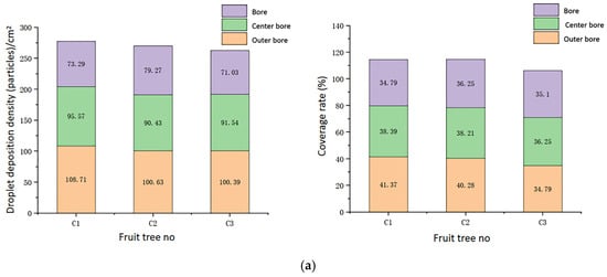 To explore the vertical distribution pattern of spray droplet deposition within the fruit tree canopy, the density and coverage of spray droplet deposition in the upper, middle, and lower canopy layers were compared, as shown in Figure 14b. As indicated in the figure, the vertical distribution of spray droplets generally follows the trend of lower > middle > upper, aligning with the characteristics of the fusiform fruit tree canopy shape. The average spray droplet deposition densities in the upper, middle, and lower layers were 74.49 grains/cm2, 90.76 grains/cm2, and 92.35 grains/cm2, respectively—all exceeding the standards for orchard spraying operations. The average spray droplet coverage values for the upper, middle, and lower canopy layers were 35.36%, 37.82%, and 38.76%, respectively, all meeting the criteria for orchard application quality.
