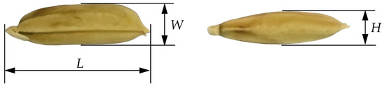 At each moisture level, the length (L), width (W), and thickness (H) of the rice grains were measured using digital vernier calipers (0.01 mm) by randomly selecting 200 rice grains, as shown in Figure 1. The dimensions of each grain were measured three times, and the final results were taken as the average of the grain dimensions at each moisture content. In this case, the length, width, and thickness of the long-grain rice ranged from 9.20 to 9.31 mm, 2.84 to 2.87 mm, and 2.11 to 2.14 mm, respectively, within the moisture content range of 13.75% to 24.34%.
