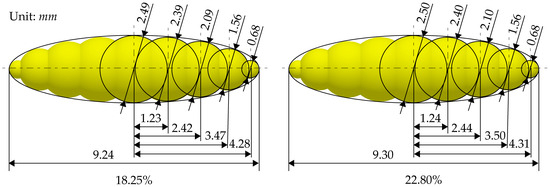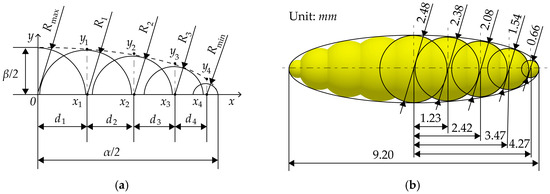 where is the radius Rmin of the smallest inscribed tangent circle within the ellipse, mm; is the center-to-center distance between the filling spheres within the ellipse, mm; is the center coordinate of the filled circle within the ellipse, mm; and is the point on the ellipse, mm.