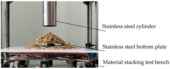 The repose angle is an important response variable that reflects the friction and flow properties of material particles and is widely used for calibrating discrete element parameters. In this study, the repose angle at different moisture contents was measured using the cylinder lifting method. The diameter of the cylinder was determined based on the particle size of the long-grain rice to be measured. Specifically, the cylinder diameter should be 4 to 5 times larger than the maximum particle size [33]. In this study, within the tested moisture content range, the maximum average value of the rice grains was 9.31 mm. Therefore, the cylinder diameter was set to 40 mm. The actual physical test setup is shown in Figure 3.