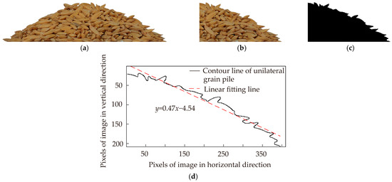 Edge contour extraction process of rice grain heap: (a) heap of rice grains; (b) unilateral heap of rice grains; (c) image binarization; (d) contour lines and linear fit of unilateral rice grain heap.