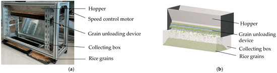 As one of the world’s most productive food crops, rice grain is vital to may countries’ economic development and food security [1]. In the key stages of rice grain processing, storage, and transportation, analyzing the movement characteristics and processing behavior of rice grains helps to reveal their dynamic mechanisms under various working conditions. This analysis also provides essential theoretical support and data for the design and optimization of efficient grain-processing systems [2,3,4]. It also contributes significantly to food preservation and loss reduction. However, since the mechanical equipment is typically enclosed, directly observing the complete movement process of paddy is difficult, making comprehensive analysis through mathematical modeling challenging. Recently, simulation technology has been widely applied in the agricultural field. The discrete element method (DEM) provides a practical approach to simulating and analyzing the interaction mechanisms between rice grains, as well as between rice grains and mechanical components [5,6,7].