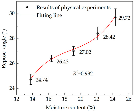 As shown in Figure 7, the regression model exhibits a strong correlation with the actual data ( = 0.992). The fitted curve accurately represents the data trend, indicating that the equation was suitable for predicting the repose angle. The angle of inclination increased with the rise in moisture content of long-grain rice grains. At low moisture contents, the surface of the long-grain rice was dry. The contact force between the grains was primarily governed by friction, which was influenced by surface characteristics and roughness [39]. In this state, the rice grains exhibited good fluidity. The repose angle increased by 4.98° as the moisture content of the long-grain rice rose from 13.75% to 24.34%. As the moisture content gradually increased, the size and surface area of the long-grain rice slightly expanded. This likely increased the effective contact area, which in turn enhanced friction between grains, as well as between the grains and the steel plate surface [40]. In addition, the static coefficient of friction between the rice grains significantly increased with increasing moisture content. This inhibited the relative sliding of the rice grains, reduced their mobility, and led to an increase in the repose angle [40,41].