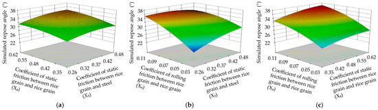 As shown in Table 6, the interaction term had a highly significant effect on the angle of repose, whereas and showed no significant effect. Response surface plots depicting the interaction between , , and on the repose angle of long-grain rice at different moisture contents are shown in Figure 8. As shown in Figure 8a, the repose angle of long-grain rice increased with the rise of and when was 0.07. Specifically, the repose angle was in the larger range of values when and were greater than 0.37 and 0.48, respectively. As shown in Figure 8b, the repose angle of the long-grain rice increased with the rise of and when was 0.48. The change in the value of had a more significant effect on the repose angle of rice grains than change in . Meanwhile, the repose angle was generally greater than 32° when took values between 0.26 and 0.48 and was greater than 0.07. As shown in Figure 8c, when the significance parameter was 0.37, and and were greater than 0.42 and 0.07, respectively, the repose angle value was larger for rice grain.