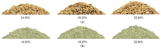 - Bai, J.; Xie, B.; Yan, J.; Zheng, Y.; Liu, N.; Zhang, Q. Moisture content characterization method of wet particles of brown rice based on discrete element simulation. Powder Technol. 2023, 428, 118775. [Google Scholar] [CrossRef]