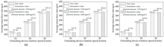 Simulation and experimental comparison of unloading mass flow rates of rice grains at different moisture contents and rotational speeds. (a) Moisture content of 14.50%; (b) moisture content of 18.25%; (c) moisture content of 22.80%.