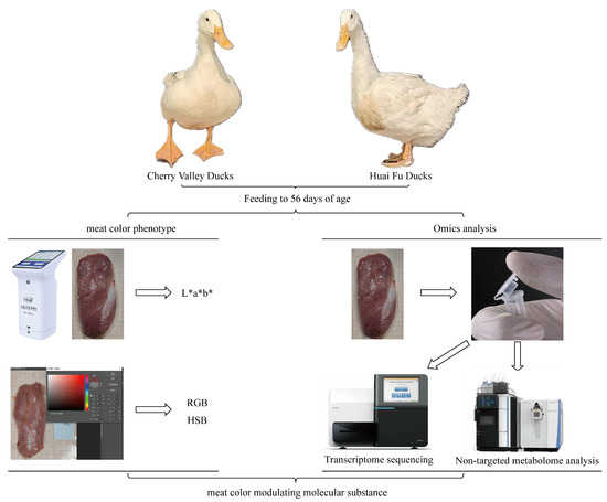 Technological route. Note: Cherry Valley ducks and Huai Fu ducks: the two different breeds of ducks used in the experiment. Feeding to 56 days of age: the ducks were fed until they reached 56 days of age. Meat color phenotype analysis: lab measurement: using a colorimeter to measure the L*, a*, b* values of the meat; RGB/HSB analysis: using image processing software (Photoshop) (Adobe Photoshop CC 2019) to analyze the RGB and HSB values of the meat color. Omics analysis: transcriptome sequencing: analyzing gene expression levels through transcriptome sequencing; non-targeted metabolome analysis: detecting and analyzing metabolites using non-targeted metabolome analysis.