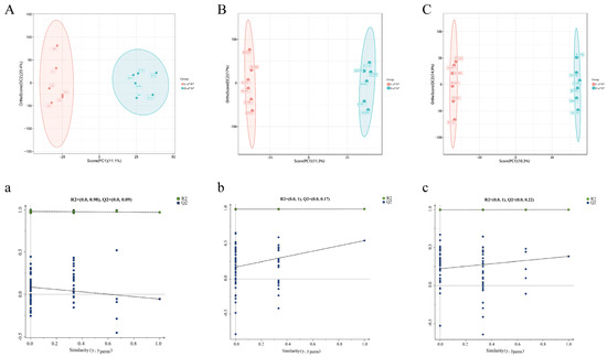 Based on the analysis of normalized data using OPLS-DA with transcriptome data as well as positive and negative ion pattern data, the results showed that PC1 of the transcriptome accounted for 11.1% of the variance (Figure 2A). In comparison, PC1 of metabolites accounted for 11.3% (positive) and 10.3% (negative) of the variance (Figure 2B,C). The samples clustered well within each group, indicating good reproducibility and reliable sample quality. The permutation plot can effectively evaluate whether the current model is overfitting. The evaluation criteria are as follows (only one needs to be satisfied): (1) all the blue Q2 points are lower than the rightmost original blue Q2 point; (2) the regression line of the Q2 point is less than or equal to zero at the intersection. The results of all groups meet the above requirements (Figure 2a–c), indicating that the established model is reliable and has good predictive ability. The remaining groups meet the above conditions (Supplementary Figure S2).