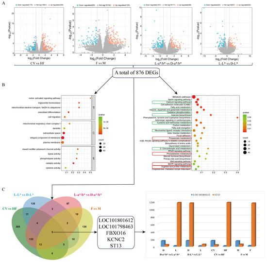 The DESeq2 package in R (v 3.4.1) was used to identify different groups of differentially expressed genes (DEGs). The results showed that 481 DEGs, comprising 306 up-regulated genes and 175 down-regulated genes, were screened in the CV and HF groups. Additionally, 190 DEGs were obtained in the F and M groups, of which 125 were up-regulated and 65 were down-regulated. A total of 265 DEGs were screened in the meat color L-a*/b* and D-a*/b* groups, among which 167 DEGs were down-regulated and 98 DEGs were up-regulated. A total of 175 DEGs were screened in the meat color L-L* and D-L* groups, including 82 up-regulated and 93 down-regulated genes (Figure 3A).