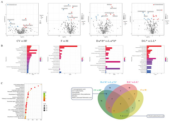 Using the groupings of the transcriptome analysis, in order to study the differences in metabolites related to meat color formation in each group, the pectoral muscle metabolites were detected by the LC-MS/MS method in positive ion and negative ion modes, respectively, and 13,891 and 12,307 metabolites were identified. After further molecular weight determination and matching annotation in the database, 333 representative metabolites were identified, which covered 39 categories, mainly including lipids, alcohols, phenols, polyhydroxyl compound nucleic acids and their derivatives, carboxylic acids and their derivatives, amino acid derivatives, etc. Based on VIP ≥ 1 and |log2 (fold change)| ≥ 1, the following results were obtained: There were 19 different metabolites between CV and HF, of which 10 were up-regulated and 9 were down-regulated. There were 10 different metabolites between F and M, of which 5 were up-regulated and 5 were down-regulated. Between L-a*/b* and D-a*/b*, eight were up-regulated and seven were down-regulated. Between L-L* and D-L*, 10 were up-regulated and 9 were down-regulated (Figure 4A).
