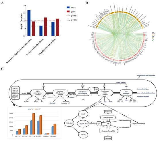To further investigate the biological mechanism affecting meat color phenotype, this study integrated transcriptomic and metabolomic data of CV ducks and HF ducks, screened out the pathway of co-enrichment of genes and metabolites under the significant threshold value of p-value < 0.05, and conducted KEGG co-enrichment analysis. It was found that these genes and metabolites are co-enriched mainly in three pathways: oxidative phosphorylation, neuroactive ligand–receptor interaction, and phenylalanine metabolism (Figure 5A).