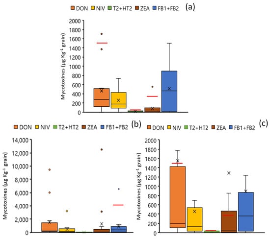Box Plot of the distribution of mycotoxin concentrations in maize grains. (a): at harvest, (b): after storage, (c): after storage with a scale limited to 2000 µg kg−1. Red lines are the maximal levels in the European Commission regulation.