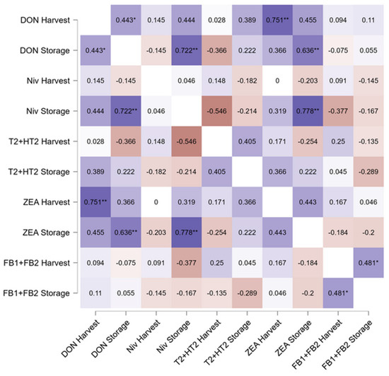 Correlations between mycotoxin concentrations measured in maize at harvest and after storage, Kendall’s tau B heatmap. * p < 0.05, ** p < 0.01.