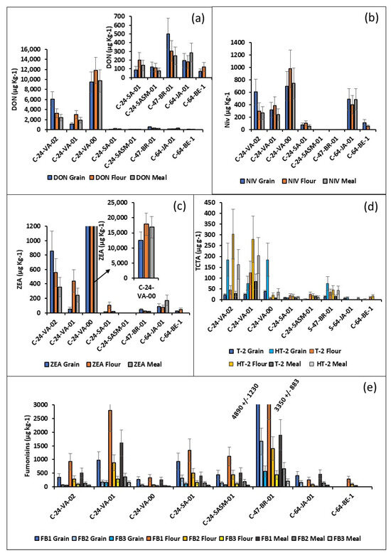 Mycotoxin concentrations measured in grains after storage and milling products obtained on eight farms. (a): DON, (b): Niv, (c): ZEA, (d): T-2 and HT-2, (e): FB1, FB2 and FB3. Error bars are +/− uncertainties.
