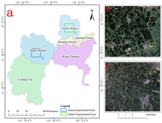 (a) Mapped locations of experimental areas for farmland plot extraction in Changzhou, China; Gaofen-2 remotely sensed photos of the experimental zones in (b) Xinbei and (c) Jintan districts, Jiangsu, China.