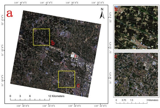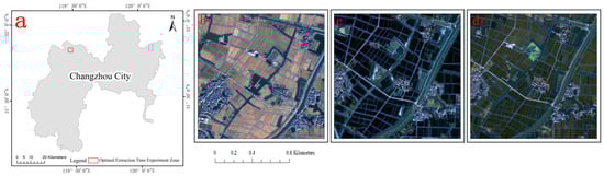 This study took the districts of Xinbei and Jintan in Changzhou City, Jiangsu Province, China, as the study areas, using a Gaofen-2 image covering an area of 100 km2 to delineate the experimental area (Figure 1). The region was mainly dominated by agriculture, with a widespread distribution of farmland plots. These plots can be classified into regularly and irregularly shaped farmland plots based on their shapes (Figure 2), where b and c represent regularly and irregularly shaped farmland plot types, respectively. Analysis indicated that land plots near urban or residential areas were scattered, often appearing as irregularly shaped farmland plot types. The main crops grown in the study area during the summer and autumn seasons include rice, corn, and soybeans, which are typically harvested between September and October.
