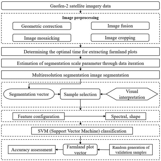 Workflow of farmland plot extraction using object-based multi-scale segmentation and support vector machine fusion.