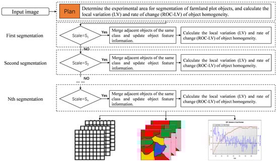 Image segmentation is a crucial step in the object-oriented classification process, and the scale parameter of image segmentation is important for classification accuracy. In this study, a multi-scale segmentation algorithm based on object-oriented analysis was employed to segment images during the reproductive growth stage. This algorithm uses the homogeneity criteria of spectral, shape, and spatial texture features of farmland plots for optimal parameter estimation, thereby achieving optimized homogeneous segmentation of the study area images. The main segmentation parameters include band weights, homogeneity factors, and segmentation scales. The technical workflow for determining the segmentation parameters is as follows: (1) set band weights; (2) determine homogeneity factors; and (3) calculate the local variance () and rate of change of local variance () to determine the optimal segmentation scale.