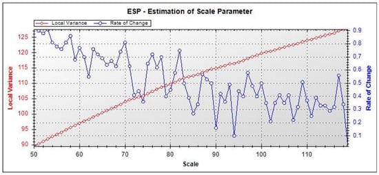 This study, based on the local optimization iterative method for determining the optimal segmentation scale, selected a 100 m2 test area of farmland imagery and conducted multi-scale segmentation experiments with segmentation scales set within a 50–120 iteration interval and with a step size of 1. The and values were calculated from the experimental data (Figure 6). By analyzing the multiple peaks obtained, multi-scale segmentation experiments were performed on the 100 m2 test area of farmland imagery. Ultimately, the optimal segmentation scale for the farmland plots was determined to be 59.