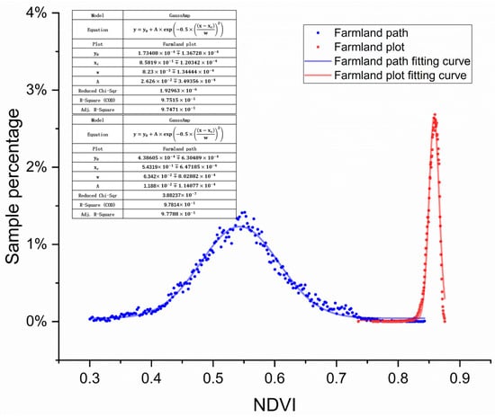 Comparison of Gaussian fitting curves for the Normalized Difference Vegetation Index (NDVI) values between farmland plot and farmland path samples.