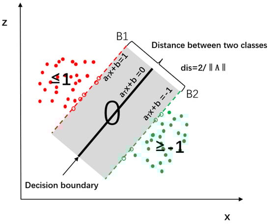 The basic model of an SVM is designed to define a linear classifier with the maximum margin in the feature space. Unlike the perceptron, it seeks to solve for the separation hyperplane that can correctly divide the training dataset while maximizing the geometric margin. For linearly separable datasets, such a hyperplane is unique (Figure 8) [,].
