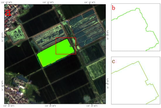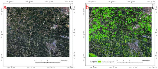 Based on the above research approach, this study used Xinbei as the study area for the extraction of irregularly shaped farmland plots. A satellite image covering 100 km2 of the study area was selected as the experimental image (RGB: 4, 3, 2) for the extraction of farmland plots, and the experimental results were obtained (Figure 11).