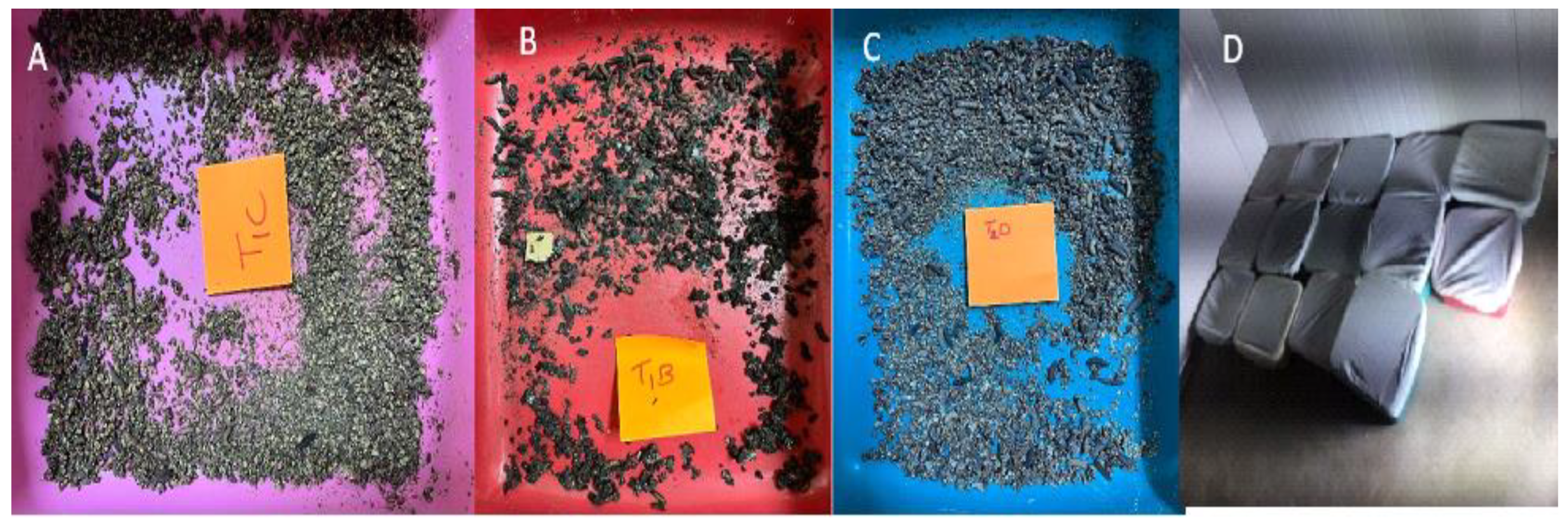 The motivation for mixing sludge and chicken feed stems from the need to balance nutrient availability with safety [5]. Since BSF larvae live within and actively consume the substrate, its composition directly impacts their development and the quality of the resulting frass. The addition of chicken feed enriches the nutrient content, while sludge reuse addresses environmental waste management goals [13,14,15].