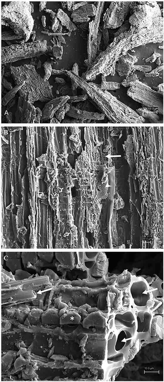 Scanning electron microscopy (SEM) is commonly used to assess the physical morphology of solid substances. SEM micrographs revealed that this biochar showed porosity due to the original tubular structures in the plant cell materials (Figure 1). The biochar samples presented only large fragments of plant material, not less than 100 µm for their minor axis, which were mainly formed of wood samples (Figure 1A). High magnification showed xylem vessels and fibers and large surfaces as the samples were large in dimension and essentially formed by empty tubes (Figure 1C arrows). Vessels showed larger pits at the ray/vessel junction or smaller pits along the vessel longitudinal wall (Figure 1B arrow and arrowhead, respectively). Radial parenchyma appeared to be formed by well-preserved cells (Figure 1, asterisk). The cytological characters were consistent with those of Castanea sativa wood, in particular the presence and distribution of pits and simple perforation in the tracheids (Figure 1A,B). Fragments of different wood types were very occasionally observed, which belonged to gymnosperm plants. In fact, fiber tracheids with a homogeneous diameter (Figure S1C–F) and areolate pits in longitudinal cell walls were observed (Figure S1D,F arrows). Vessels presented different pits in the ray–vessel intersections: pits were taxodioid as in Picea (Figure S1F; arrowhead) or large cupressoids (Figure S1D; arrowhead). In the vessels with cupressoid pits, spiral thickening of the cell walls was also observed, which suggested that the fragment belonged to the genus Taxus (Figure S1C,D).