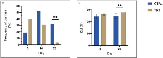 Frequency of diarrhea between the control group (CTRL) and treatment group (TRT) on days 0, 14, and 28 (a). DM (%) between the CTRL and TRT groups on days 0 and 28 (b). The data of % DM are shown as the mean and standard deviation. Asterisks with different superscripts indicate significantly different means; ** p ≤ 0.015.