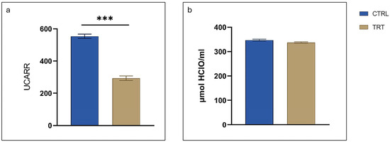 Comparison of the serum oxidative status (a) and antioxidant barrier (b) on day 28 (d28) between the control group (CTRL) and treatment group (TRT). The data are shown as the mean and standard deviation. Asterisks with different superscripts indicate significantly different means; *** p ≤ 0.001.