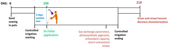A pot experiment was conducted to evaluate the effect of three selenium concentrations, 0, 16, and 160 g ha−1, on wheat physiological, biochemical, morphological, and yield parameters under well-watered (WW) and water-deficit (WD) conditions. For each experimental condition studied, 10 pots were used, with four seeds per pot sown evenly at 2–3 cm deep using a hand drill. The experiment was carried out at the University of Trás-os-Montes and Alto Douro in Vila Real, Northeast Portugal (41°17′07.0″ N, 7°44′23.5″ W, 465 m a.s.l.). The 6 L pots were filled with typical local soil mixed with peat in 3:1 (v/v) proportion. The soil is classified as acidic sandy loam Dystric Cambisol (68% sand, 22% silt, 10% clay), with a water pH of 5.2, 2.8% of organic matter, 48 mg kg−1 of available P (Egner–Riehm), and 130 mg kg−1 of available K (Egner–Riehm). The pots were maintained in rainfed conditions until the jointing phase of the wheat growth stage [37] (Figure 1). Then, the pots were moved to the inside of the greenhouse (145 Days After Sowing—DAS), and, after 5 days of acclimation period, differential irrigation was carried out (150 DAS) through two water regimes, as follows: well-watered (WW, irrigation at Field Capacity—FC) and water-deficit (WD, irrigation at 25% FC) conditions. For this purpose, a portable TDR miniTrase (Soil Moisture Equipment Corp., Goleta, CA, USA) was used to monitor water content in the soil to maintain the defined WW and WD conditions. The Se foliar treatments were applied by spraying leaves following excellent standard procedures and efficacy practices adjusted for agricultural experiments. The three Se solutions (0, 16, and 160 g ha−1 Se) were prepared with distilled water, sodium selenate (Na2SeO4·10H2O, Sigma Aldrich, St. Louis, MO, USA), and Tween 20 (0.1%). The solutions were freshly prepared, and 500 mL solution was homogeneously applied to each set of 10 pots using a hand sprayer during the mid-morning. Pots with the target plants were surrounded with plastic barriers to avoid spraying nearby plants. A total of 30 days after initiating controlled irrigation (150 DAS), the pots were left non-irrigated until harvest (210 DAS) in the greenhouse. This mimicked the natural reduction in precipitation and the increase in temperature characteristic of late spring and early summer that drives the final dehydration of the plant and maturation of the wheat grain. During all stages of wheat plant development, weeds were meticulously controlled to avoid nutrient and water competition.