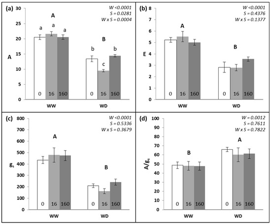 (a) Net photosynthetic rate (A, μmol CO2 m−2 s−1), (b) transpiration rate (E, mmol H2O m−2 s−1), (c) stomatal conductance (gs, mmol H2O m−2 s−1), and (d) intrinsic water use efficiency (A/gs, µmol mol−1) in wheat plants (means ± SE, n = 12) grown under two water regimes (WW—well-watered; and WD—water-deficit) and in response to three Se foliar spray treatments (0, 16, and 160 g ha−1 Se). Different capital letters demonstrate significant differences among water regimes and small letters demonstrate significant differences among all treatments (p < 0.05).