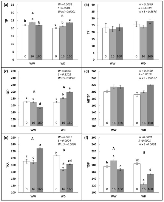 (a) Total phenols (TP), (b) total flavonoids (TF), (c) ortho-diphenols (OD), (d) ABTS+, (e) total soluble sugars (TSS), and (f) total soluble proteins (TSP) quantified in plants grown under well-watered (WW) and water-deficit (WD) conditions, and in response to three Se foliar spray treatments, 0, 16, and 160 g ha−1 Se. Values are means ± SE by DW (n = 12). Different capital letters demonstrate significant differences among water regimes, and small letters demonstrate significant differences among all treatments (p < 0.05).