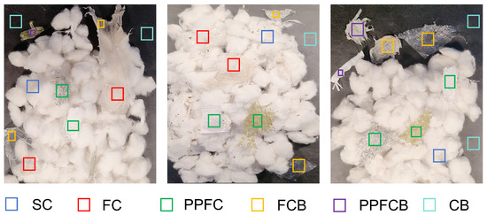 The fiber samples in this study were systematically collected from cotton farms located in Ili Prefecture, Xinjiang, using random sampling. To ensure sample diversity, factors arising from cotton cultivation and transportation, such as variations in the color of seed cotton, new and weathered mulch films, and polypropylene fibers of different colors and under different ageing conditions, were all taken into the consideration. Following the image acquisition process, the pixels were classified into the following six categories: Seed Cotton (SC), Film on Cotton (FC), Polypropylene Fibers on Cotton (PPFC), Film on the Conveyor Belt (FCB), Polypropylene Fibers on the Conveyor Belt (PPFCB), and Conveyor Belt (CB). Figure 1 presents representative images of each sample type captured under visible light.