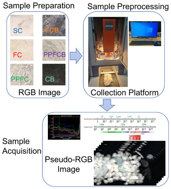 The acquired hyperspectral data were stored in a raw format, with dimensions of 674 × 384 × 288 (rows × columns × bands), facilitating the efficient organization and extraction of foreign fiber data from the seed cotton. The sample acquisition process is depicted in Figure 2.