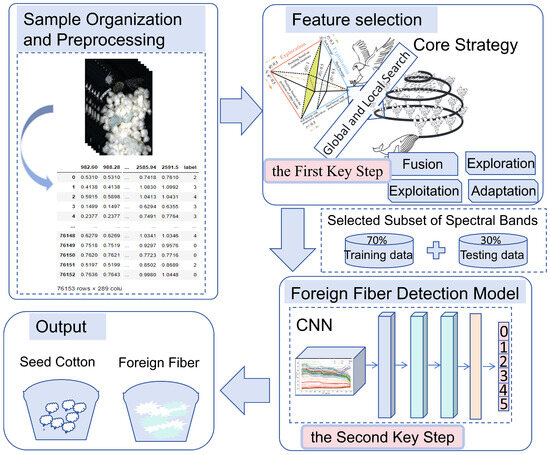 This work presents an optimized detection method for hyperspectral data on seed cotton containing multiple foreign fibers. The process, illustrated in Figure 3, comprises two key steps. The first key step focuses on the development of an optimized feature selection algorithm to eliminate noise and redundant information from the 288-band hyperspectral data. The second key step constructs an accurate, efficient, and lightweight CNN model, aiming to effectively sort the seed cotton and foreign fibers. This design ensures a robust detection performance while maintaining its cost-effectiveness. The feature selection is closely linked to the CNN model; specifically, the band selection process significantly reduces the high dimensionality of the hyperspectral data, allowing the CNN model to focus on the most informative spectral features and avoiding the inclusion of redundant or less informative spectral bands. The selected subset of spectral bands is used as the input for the CNN, which makes the model more computationally efficient. This reduction in dimensionality facilitates a faster performance during both the training and inference phases.