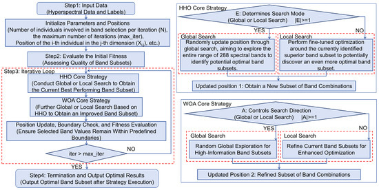 This study proposes an efficient optimization strategy aiming to enhance the band selection and feature detection capabilities for hyperspectral data. This strategy integrates the advantages of Harris Hawks Optimization (HHO) [26] and the Whale Optimization Algorithm (WOA) [27], where HHO excels in global searches and leapfrogging exploration, while the WOA excels in local fine searches and iterative approximation. By merging the core strategies of these two algorithms, the synergy between global searching and local fine searching is enhanced, enabling dynamic adjustments and multidimensional updates during the optimization process, thereby effectively approaching the optimal band subset. Furthermore, this strategy employs a fitness function during the iterative process to accurately evaluate the performance of the subsets, thereby addressing the dimensionality reduction and feature selection issues for seed cotton–foreign fiber hyperspectral data. In this study, this strategy is named the Harris Hawks and Whale Optimization Operator (HWOO). A flowchart of the HWOO’s implementation is shown in Figure 4, with the main processes described as follows.